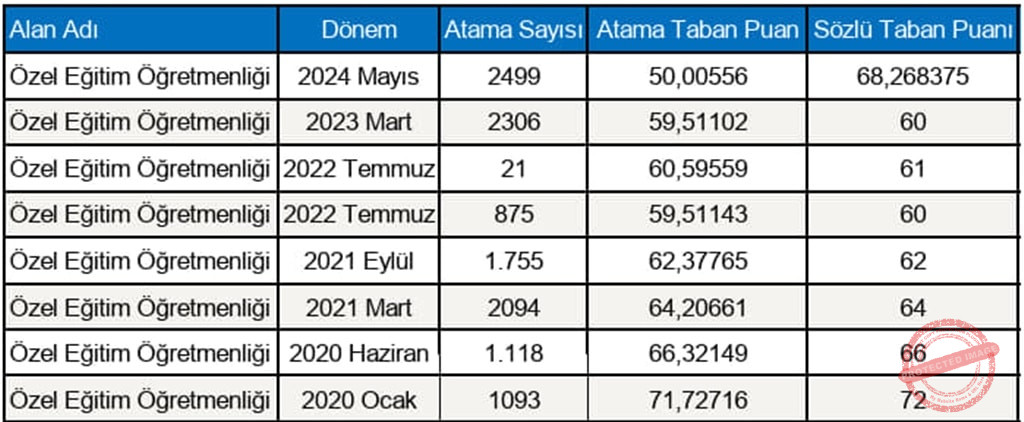 Her yıl KPSS (Kamu Personeli Seçme Sınavı) sonuçlarına göre öğretmen adayları atanır. Özel Eğitim Öğretmenliği için de KPSS puanları belirleyici bir rol oynar. Atama taban puanı, adayların atanma şansı bulabilmesi için gereken en düşük puanı ifade eder. Özel eğitim atama puanları, her yıl branş ve kontenjanlara göre değişiklik gösteren bir kriterdir. Bu puanlar, yıldan yıla değişiklik gösterebilir.